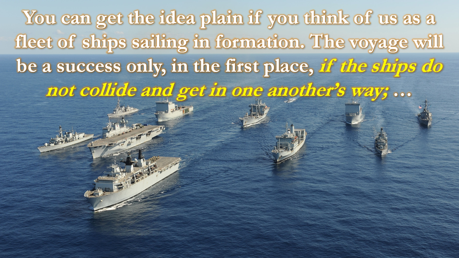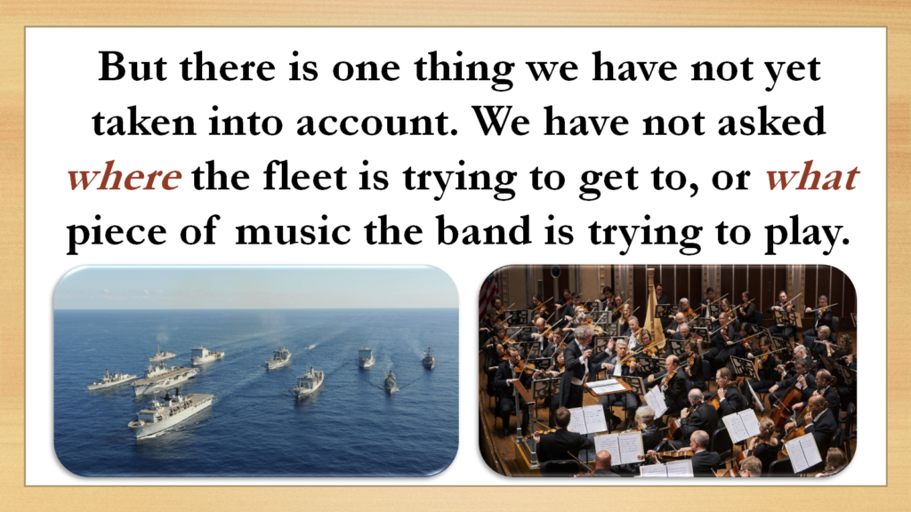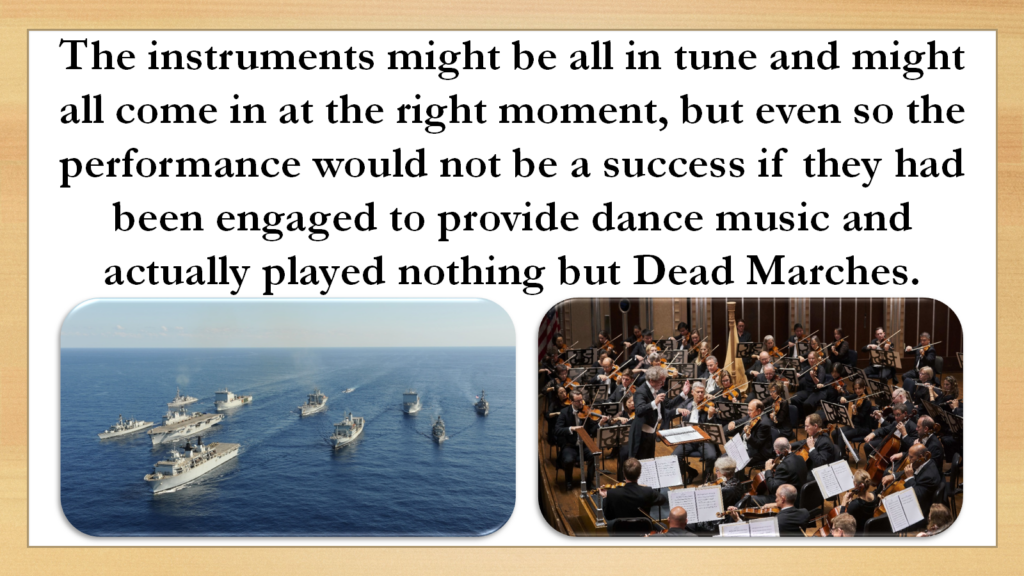 For those less nautically minded, he then applies the same thought process to a band attempting to play a tune. “To get a good result, you need two things,” he notes. First, “each player’s individual instrument must be in tune”; second, “each must come in at the right moment so as to combine with all the others.” To complete the explanation, however, Lewis adds another layer: