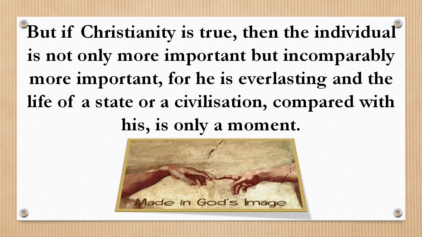 Christianity asserts that every individual human being is going to live for ever, and this must be either true or false. Now there are a good many things which would not be worth bothering about if I were going to live only seventy years, but which I had better bother about very seriously if I am going to live for ever.